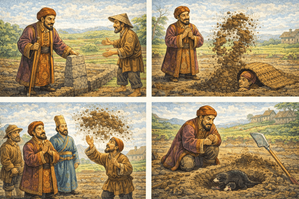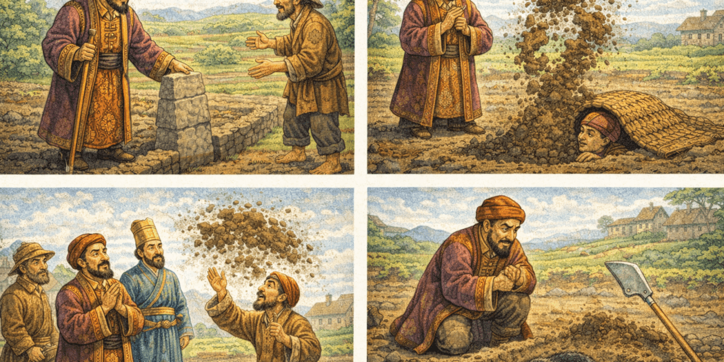 Живял някога един богаташ, ама много алчен и безчестен. Той премествал синурите в нивите и така ограбвал всичките си съседи. С лъжи и заплахи ги притискал и накрая им взимал имота.