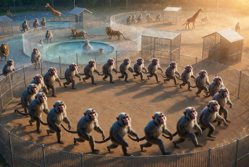Един ден маймуните в зоологическата градина решили да направят пътешествие с учебна цел. Вървели, вървели, спрели и една от тях попитала: — Какво се вижда? — Клетката на лъва, басейна на тюлените и къщата на жирафа. — Колко е голям светът, колко е поучително да се пътува. Отново тръгнали на път и сп…