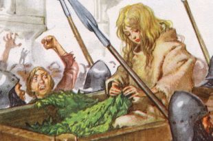 А жената си отишла в къщи, наточила ножа, скрила го в пазвата си и седнала да преде.