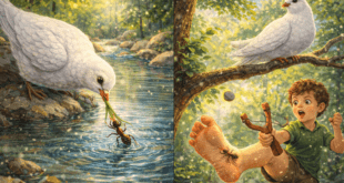 Един гарван, кацнал на едно дърво, стискаше в човката си парче сирене.Хитрата лисица, привлечена от …