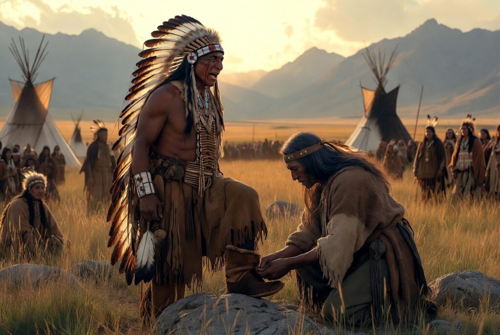 Без да се бави, жрецът коленичил пред вожда, извадил двата предмета от вързопчето и сложил всеки от тях на краката на вожда. Вождът усетил как сякаш чифт мечешки безкосмени лапи заместили босите му крака и отначало се озадачил, като гледал двете калъфчета от лосова кожа, изработени от жреца.