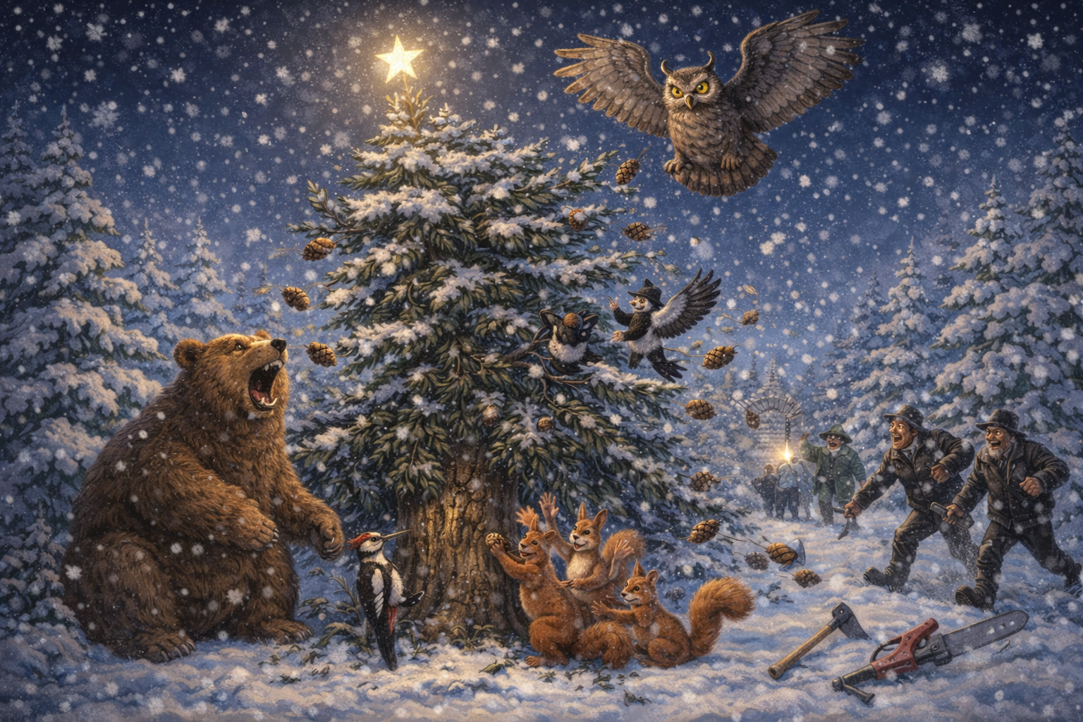 Луди птици! – бранеха се мъжете. – Ау-у-у! Започнаха да кълват! В това време катеричите семейства се събудиха. Всички Скокльови и Рошльови изскокнаха от хралупите си, за да видят каква е тази олелия навън. Бързо разбраха, че птиците имат нужда от тяхната подкрепа и тогава всички – и големите, и малките се включиха в отбраната на бора. Те късаха шишарки от клоните и замеряха с тях секачите, за да им попречат да режат дървото. Когато шишарките по клоните свършиха, катеричките започнаха да изнасят от своите зимни запаси, за да ги хвърлят върху двамата лоши човеци. Силен хор от грачене и викове огласи гората: