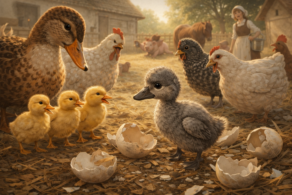 Когато и последното яйце в полога се излюпи, майка Патица остана с отворена човка: от яйцето беше излязло нещо голямо и дебело, със сива перушина, което по нищо не приличаше на патенце.
