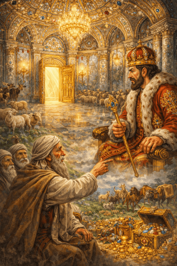Един цар притежавал безчетни богатства. Стада овце и крави, табуни коне и камили пасели в обширните му ливади, а злато, сребро и скъпоценни камъни имал толкова много, че се чудел къде да ги скрие, за да не му ограбят хазната.