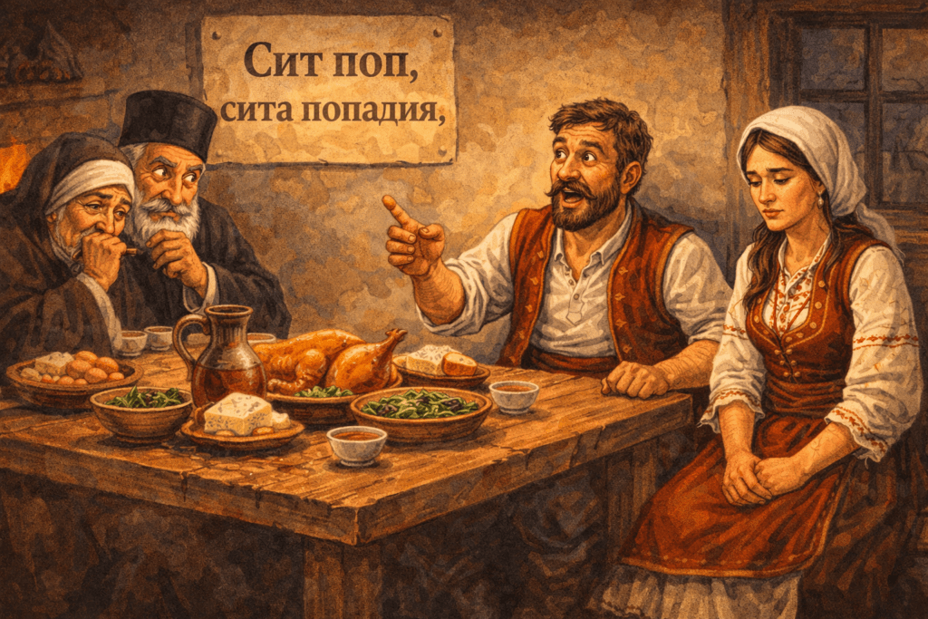 – Аз ще кръстя и попа, и попадията. Утре ще ти дойда на гости. Наготви от хубаво по-хубаво. Да видим ще смее ли свекърът ти да каже: „Сит поп, сита попадия.“