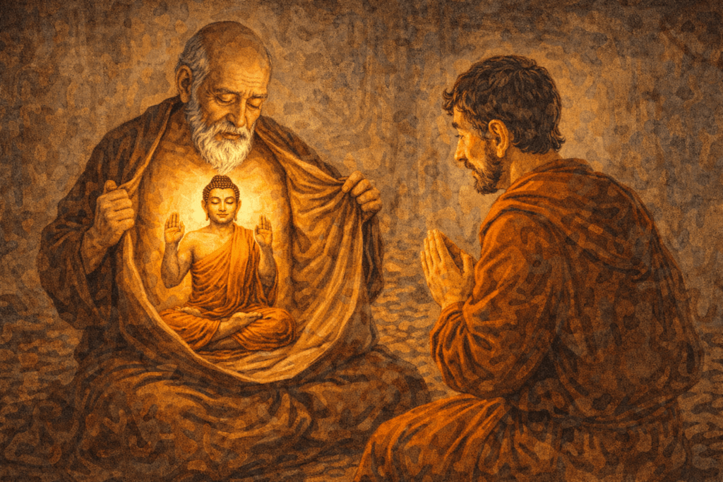 „Значи според твоя опит всичко се случва?“ И учителят не само кимнал, но и се поклонил доземи и като отворил дрехите на гърдите си, показал изображение на благословения, който давал с две ръце.