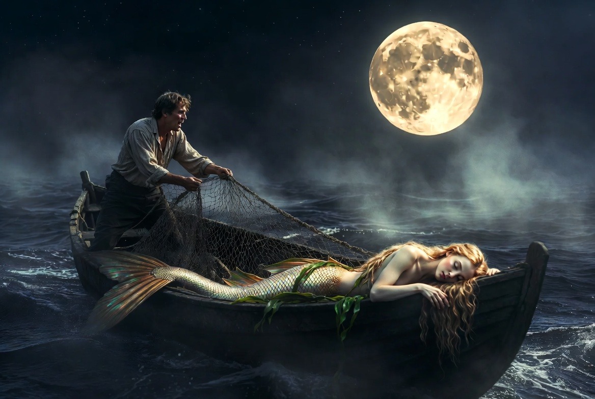 Тя беше толкова красива, че когато младият рибар я видя, ахна от изумление, протегна ръка и придърпа мрежата до себе си и като се наведе над борда, взе русалката в прегръдките си. Но щом я докосна, тя извика като изплашена чайка и се събуди, погледна го ужасена със своите, бледоморави аметистови очи и се опита да се отскубне. Но той я държеше така здраво притисната, та не се страхуваше, че ще си отиде.