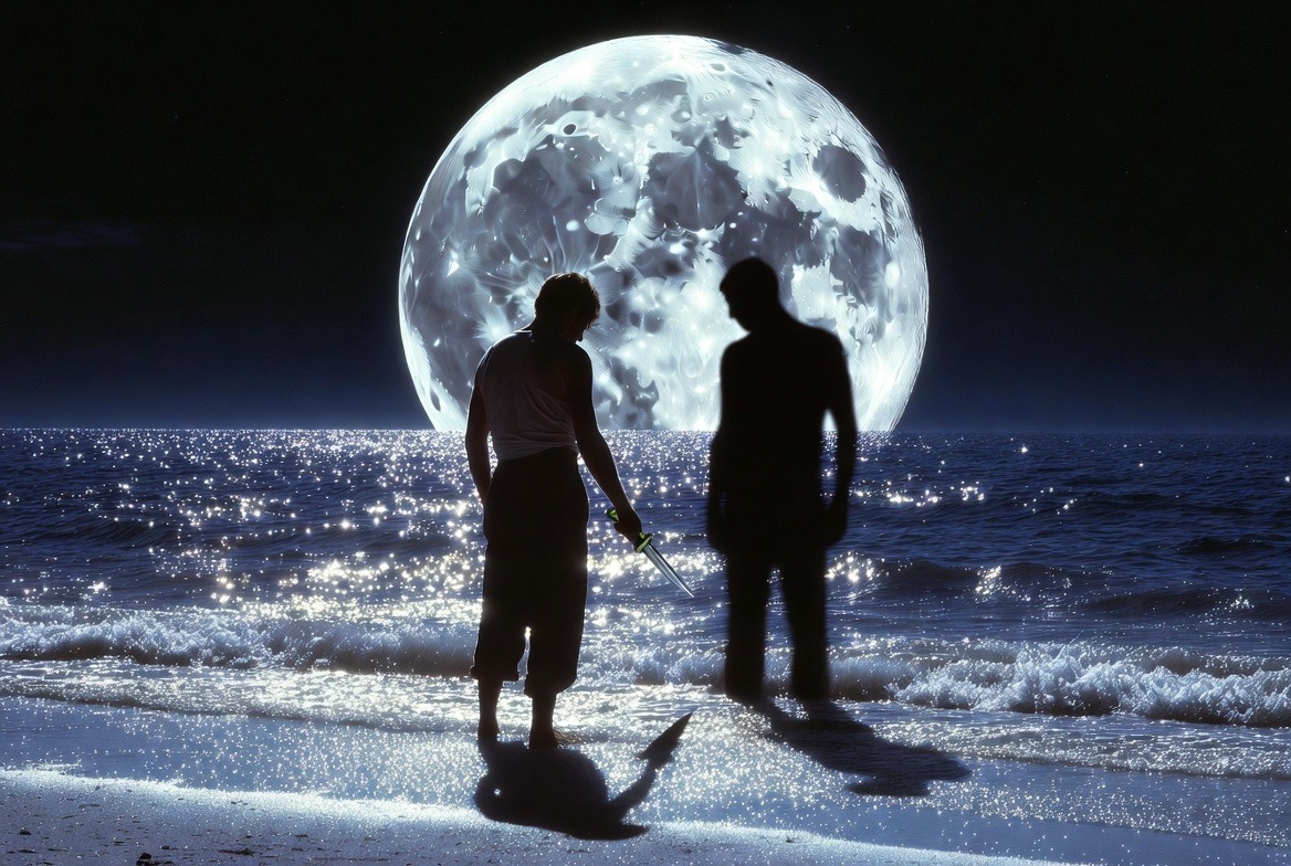 С бронзови крака и ръце и строен като статуя, изваяна от елин, той застана на пясъка с гръб към луната и от пяната се протегнаха бели ръце, които го викаха, и от вълните се надигнаха неясни очертания, които му се поклониха. Пред него лежеше сянката му, която беше тялото на неговата душа, а зад него в медноцветния въздух висеше луната.
