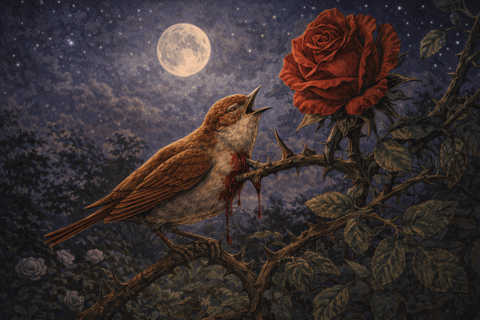 – Ако искаш червена роза – каза храстът, – можеш да я създадеш от музика на лунна светлина и да я обагриш с кръвта на собственото си сърце. Трябва да ми пееш с гърди, опрени на мой шип. Трябва да ми пееш цяла нощ, а шипът да проникне дълбоко в сърцето ти и кръвта на твоя живот да потече в моите жили и да стане моя!