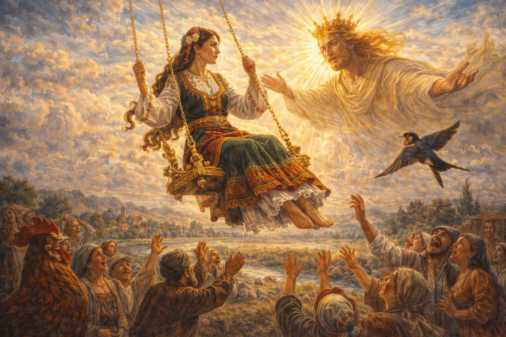– Иди, Маринке, с твоите дружки да се полюлееш! Обичай е това, не може да се погази. Облечи нова премяна, бодни си китка дъхава и бъди, дъще, мома с момите – весела, честита. Зарадвала се Марина. Накиприла се с новата си премяна, китка си боднала в косата и като кошута прип-нала към дружките си – и тя като тях да се засмее, и тя като тях да се повесели на празника. Когато седнало момичето на люлката, Господ я дигнал в небесата. Маринината майка мащеха, тичала след люлката и викала, заръчала: