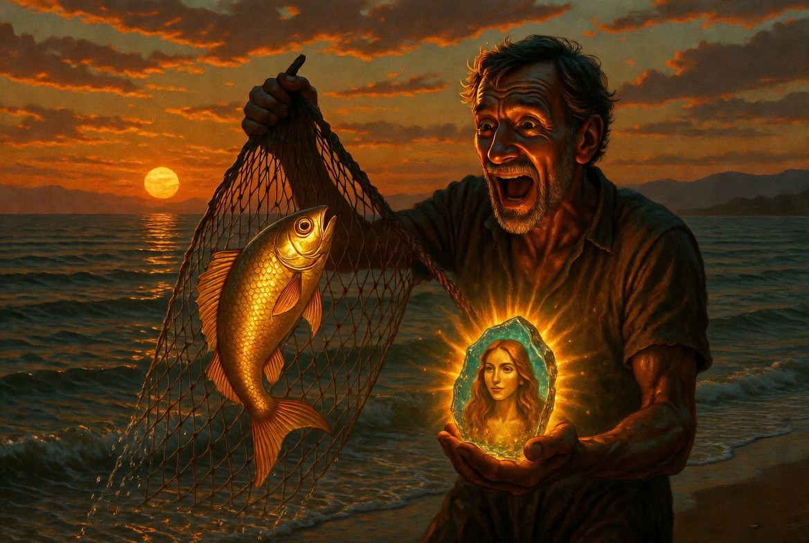 — Царю честити, на ти тоя безценен камък. Девет дена хвърлях мрежата в морето. На десетия ден хванах една златна рибка. А в рибката намерих тоя камък.