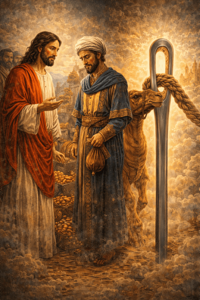 Като чул това, юношата си тръгнал натъжен, защото имал голямо имение. А Исус казал на учениците си: „Истината ви казвам, че на богатия му е трудно да влезе в Царството небесно. По-удобно е на камилата (дебело Въже) да мине през иглено ушенце, отколкото на богатия да влезе в Царството Божие.“
