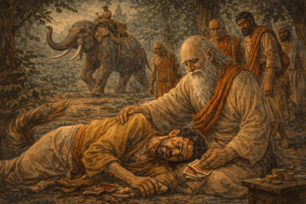 Мислейки по този начин, той останал на мястото си и приветствал слона, когато той се приближил. Ездачът продължавал да вика: „Махни се от пътя!“, но ученикът не помръднал. Бесният слон го хванал, вдигнал го във въздуха и с всичка сила го хвърлил на земята. Ученикът там и останал да лежи, целият в кръв и в безсъзнание. Мъдрецът, като чул за нещастния случай, дошъл с другите си ученици, за да отнесе пострадалия у дома. Когато след известно време ученикът дошъл на себе си, той разказал какво му се е случило. Мъдрецът му отговорил: „Приятелю мой, истина е, че Бог се проявява във всичко, но ако той беше в слона, той е бил също и в ездача. Кажи ми защо не обърна внимание на предупрежденията му?“