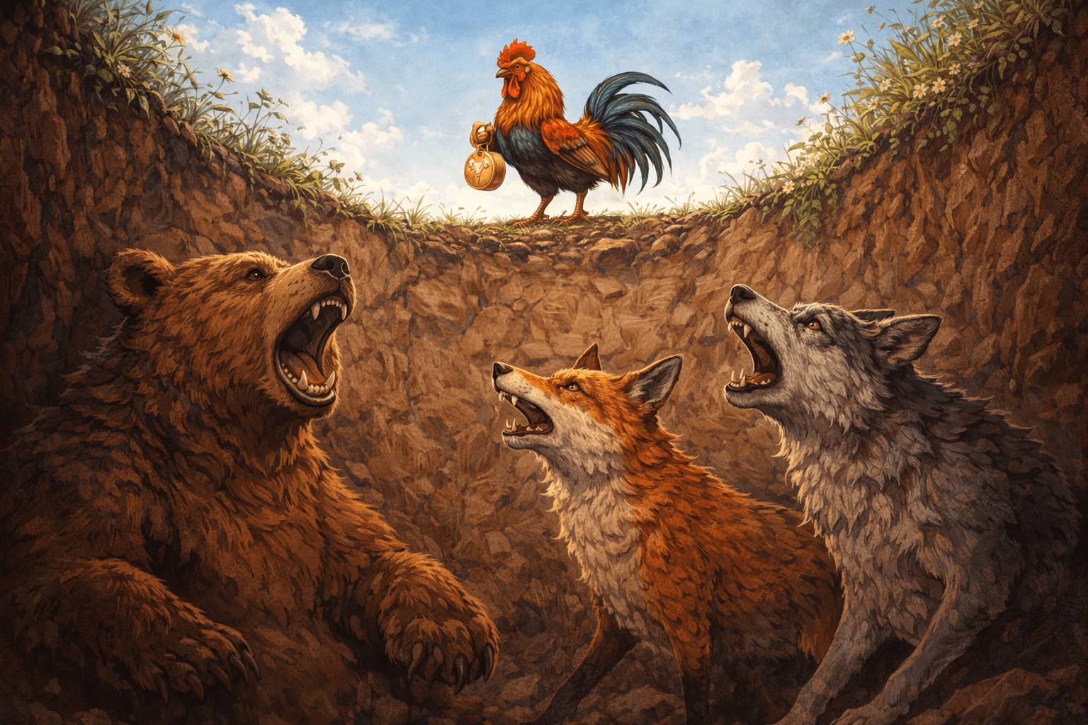 Петелът с червения гребен си ровел на торището и там си изкарвал прехраната. Веднъж, като пъпрел, той намерил една парица и тръгнал към пазара да си купи нещо за кълване. Срещнала го мечката: