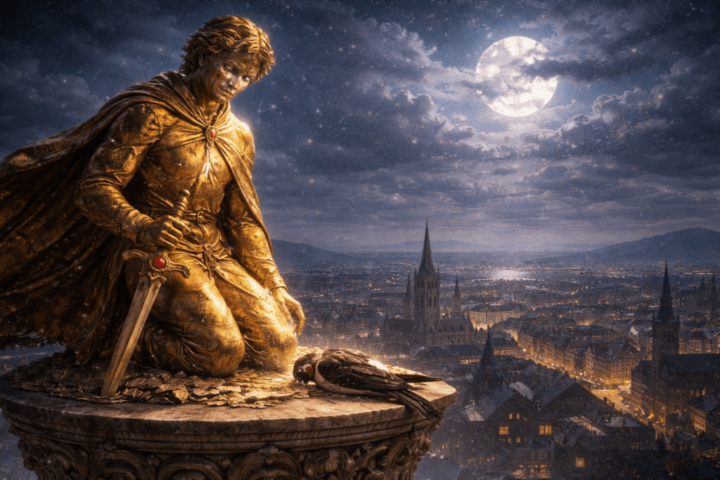 – Аз съм покрит с чисто злато – каза принцът, – трябва да го свалиш лист по лист и да го дадеш на моите бедни, живите винаги мислят, че златото може да ги направи щастливи.