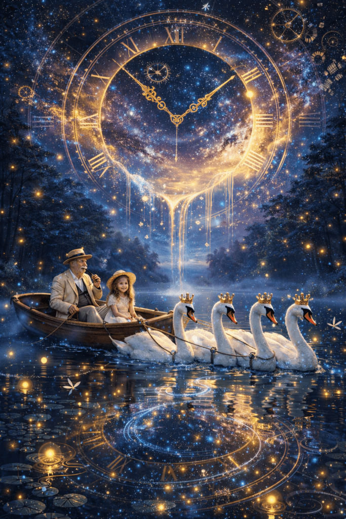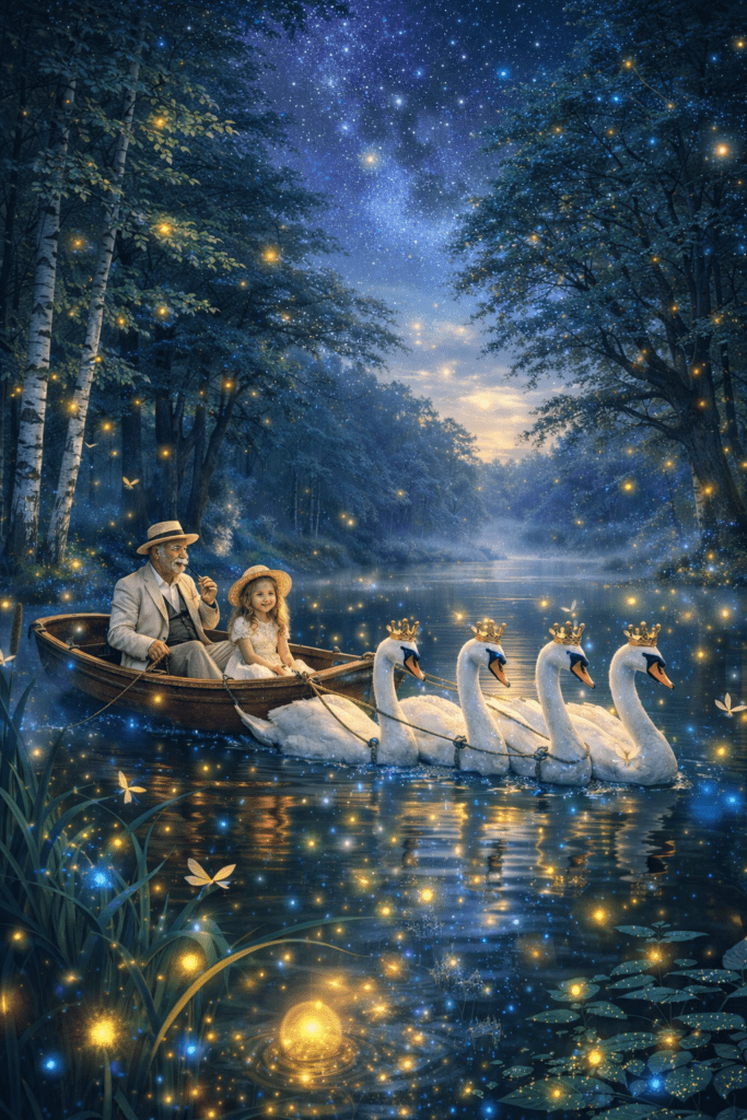 Шест бели лебеда, с корони от златна светлина, я теглеха напред — бавно, спокойно, сякаш знаеха пътя отдавна.