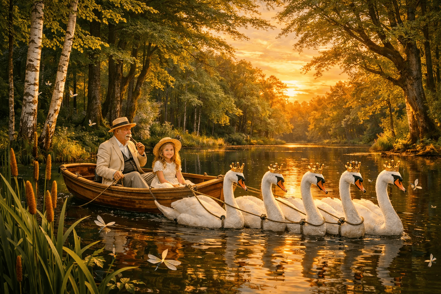 Шест бели лебеда, с корони от златна светлина, я теглеха напред — бавно, спокойно, сякаш знаеха пътя отдавна.