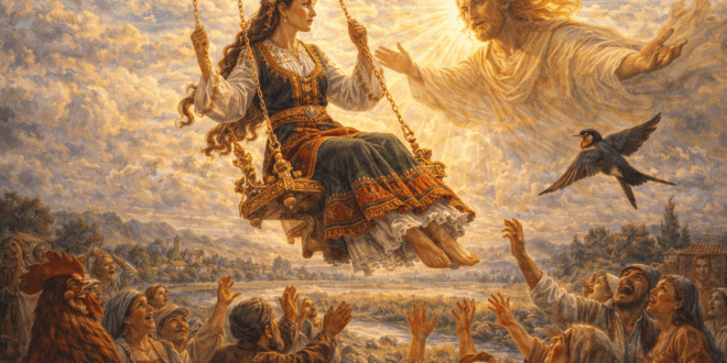 Чумата влязла в едно село и взела да мори наред хората. Един баша на пет деца също се разболял. Както си лежал на постелята, в просъница чул тропот от конски копита и звън от хлопки. Някакъв керван приближавал къщата на болния. Надигнал се той от постелята, отърсил се от съня си и посред нощ отворил вратата на къщата. Излязъл пред …