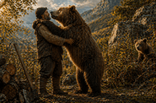 Един селянин орал нивата си край гората. Изневиделица от гората излязла една мечка и се упътила към орача. — Чичо — изръмжала мечката, — искаш ли да орем заедно? — Защо да не искам — отвърнал селянинът, разпрегнал единия вол и на негово място зажеглил мечката. Почнал да я боде с остена, за да върви по-бързо. Цял ден орали. Набраздил …