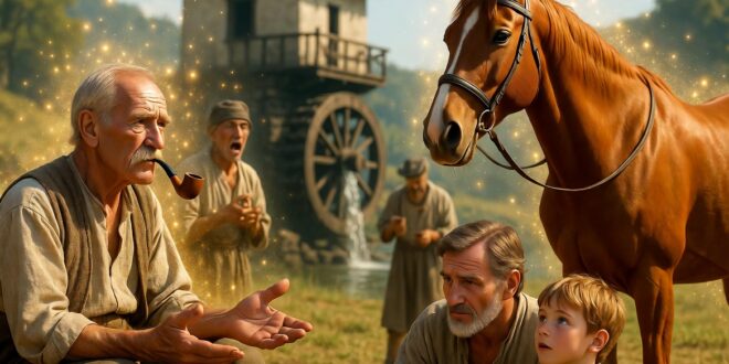 Един цар имал трима синове. Когато наближила смъртта му, той разделил царството си на две и дал на двамата си по-големи сина по половина, а на най-малкия си син дал коня и сабята си. Всички били доволни от делбата и когато старецът умрял, двамата братя станали царе, а третият възседнал бащиния си кон, взел тежката сабя, простил се с братята …