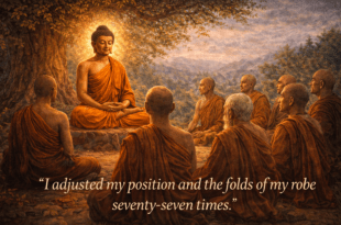 Една жена била много набожна и мечтаела да получи изображение на Буда. Работейки сутрин в градината, сред цветята тя Видяла изображение и го донесла В молитвения си ъгъл, но скоро го забравила и Буда изчезнал от олтара й. Жената намерила в градината Въртящ се блещукащ камък. Сложила го в сандък и го забравила. Тогава камъкът изчезнал. Всяко пренебрежение предизвиква загубата …