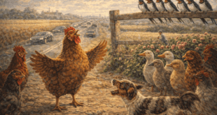 Покрай един плет, обкръжаващ птичи двор, накацали лястовички, неспокойно чуруликайки една на друга, говорейки си за много неща, но мислейки само за лятото и юга, защото есента вече била на прага – очаквал се северен вятър. Веднъж те отлетели и всички заприказвали за лястовичките и за юга. „Ще взема и аз догодина да отлетя на юг“ – казала кокошката. И …
