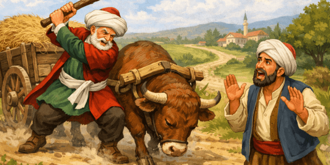 народна Един старец отишъл в гората за дърва. Намерил едно кухо дърво, размахал секирата и тупа-лупа,съборил го на земята. Като се заловил да го цепи, в кухината му намерил една кожена торба, пълна сжълтици. Зарадвал се на късмета си, натоварил цепениците на колата, окачил торбата с жълтиците наритлата и повел воловците към дома си. Вървял старецът и си мислел:– Намерих …