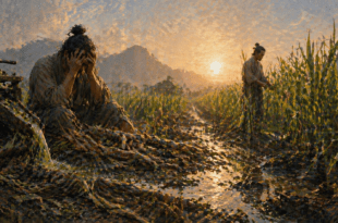 Това е румънска народна приказка, преразказана от Николай П. Тодоров Преди години накрай село живеела една старица със сина си. Живеели те бедно-пребедно. И ето че от много работа и малко ядене майката скръстила ръце и умряла. Нажаленият момък намерил няколко прогнили дъски, измайсторил един ковчег и отишъл при попа да го моли да опее покойницата. – Харно, …