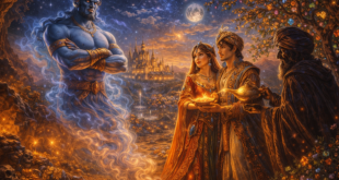 Много отдавна, в далечната китайска земя живял беден шивач на име Мустафа. Той бил честен и работлив човек, но едва можел да изхрани жена си и невръстното си дете, с което аллах ги надарил след дългогодишен бездетен живот. Погълнат от сутрин до вечер в работа, бащата нямал време да се грижи за сина си Аладин и той расъл на улицата …