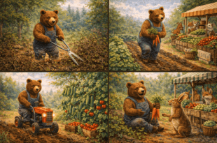 П о зелената полянкаМечо, Зайо и Лисанкатичат във ръце с балони, а пък Вятърко ги гони.Жълти, сини и червени – те са като разгорени пламъци от сухи клони… Никога до днес балони не е виждал във гората малкият немирен Вятър.Искаше да ги погали, но погрешно го разбрали,те се дърпаха далече, като дърпаха и Мечо, хванал на балонче края… Тича подир …