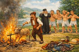 В ранно утро, в ранен час хвърли дядо Сребровлас от стопанския обор две каруци конски тор. Торът дигна топла пара от земята до небето. Дядото си сви цигара и подкара в тръс конете. Глупавият бял паток към рекичката пристъп малко да се поизкъпе. Парата като съзря, на брега глупакът спря и извика с глас висок: – Па-па-па! Гори земята! Бягайте …