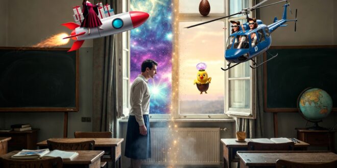 Тази история не се е случила, но сигурно ще се случи утре. Ето какво се разказва в нея: Утре една добра стара учителка завела учениците си, наредени в редица по двама, да разгледат Музея на отминалото време, където били събрани нещата от миналите времена, които не служат вече, като кралската корона, шлейфът на кралицата, трамваят от Монца и така нататък. …