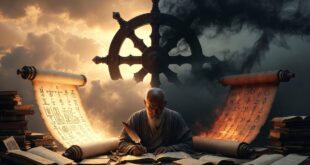 Благословеният разказал притча за Колелото на закона. При изкусен преписвач дошъл почтен човек и поръчал да препише възвание към Бога, за което донесъл достатъчно пергамент.След него дошъл човек с поръчение да препише писмо, пълно със заплахи, и също дал пергамент, като подканил преписвана да приключи по-бързо.