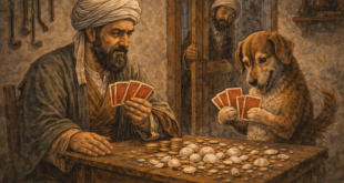 Настрадин Ходжа играел на карти с кучето си. Видял го негов познат и много се учудил – песът наистина играел. Той казал на Настрадин: „Имаш удивително мъдър, пес!“ Настрадин отговорил: „Нищо подобно – той не е толкова мъдър, колкото изглежда. Когато има хубави карти, маха с опашка!“