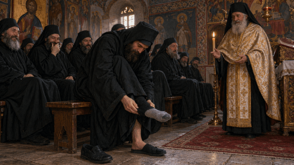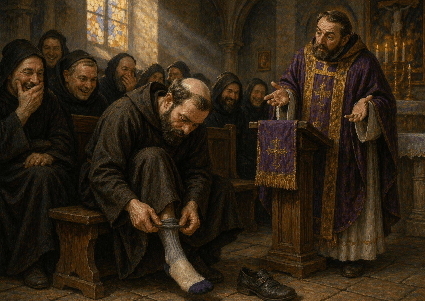 Един набожен монах седял на първия ред на неделната служба. Изведнъж той се навел и започнал да си сваля обувката. Толкова необикновена процедура по средата на службата накарала тези, които забелязали това, да се усмихнат и за кратко да отклонят вниманието си от службата. След това братът започнал да си сваля чорапа. Това предизвикало такъв безпорядък, че свещенослужителят прекъснал службата и попитал брата дали не се е случило нещо.