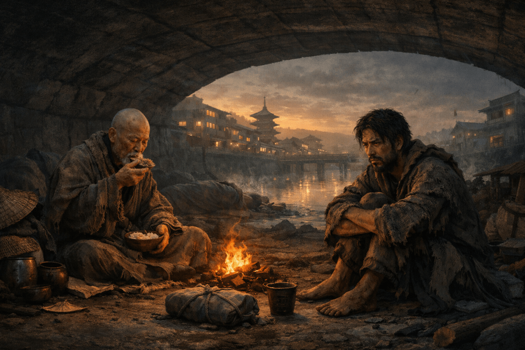 И така, бившият ученик се облякъл като просяк и прекарал деня с Тусуи. На следващия ден един от просяците умрял. В полунощ Тусуи и ученикът измъкнали тялото му и го погребали на склона на планината. След това се върнали под моста. Остатъкът от нощта Тусуи спокойно си хъркал, но ученикът не можел да заспи. На сутринта Тусуи казал: „Днес не е необходимо да се носи храна. Другарят ни е оставил това-онова.“ Но ученикът не можел да яде нищо.