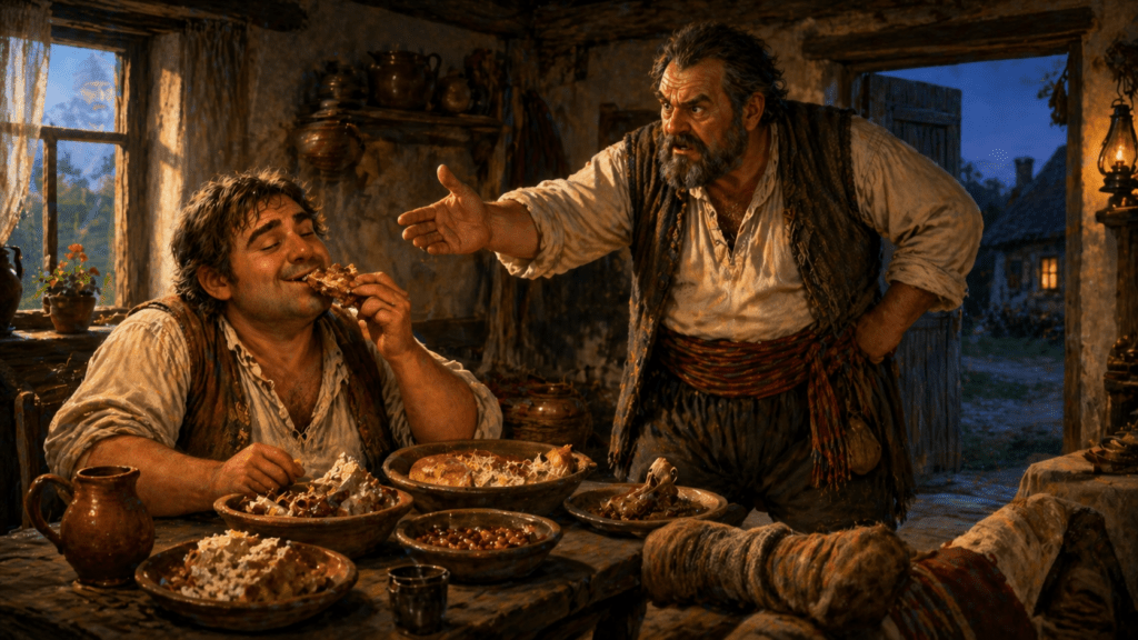 Имало едно време един богат и стиснат селянин. През усиления летен сезон той наемал жетвари, косачи и други работници, които трябвало да отговарят на две условия – много да се трудят, а да искат малко пари.
