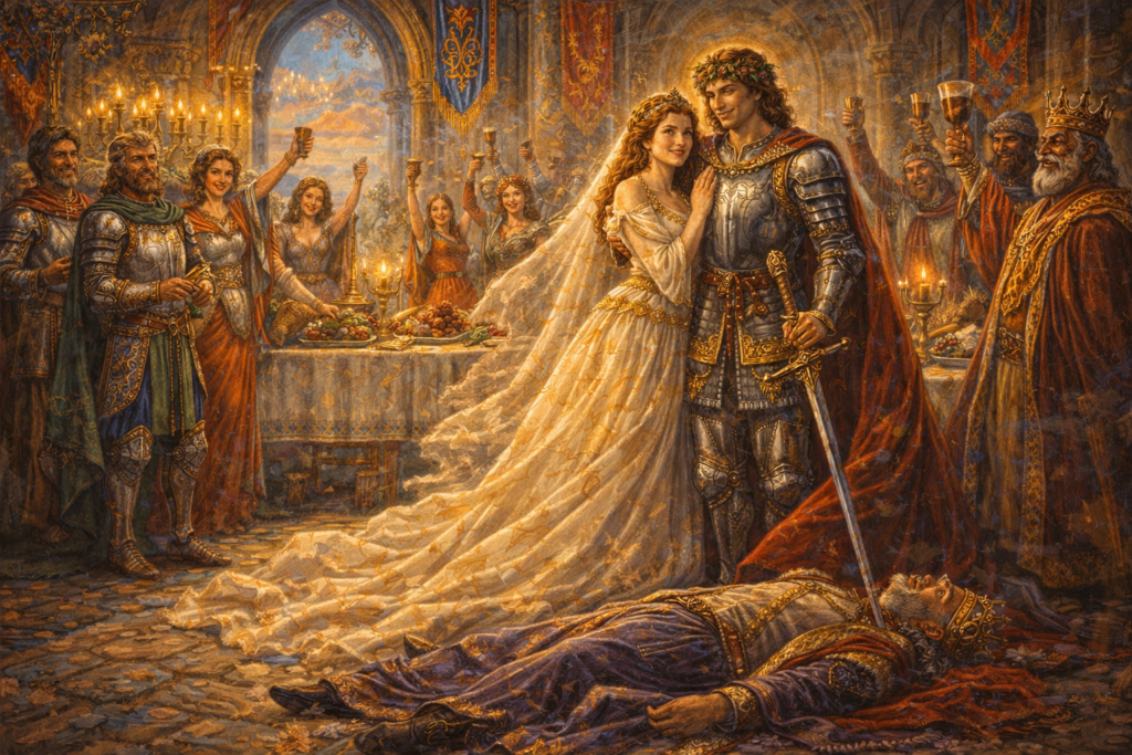 Бабичката облякла царския син в женски дрехи, забулили си лицата и отишли на царската сватба. Най-напред честитили на царя, а после влезли в стаята на хубавицата. Тя скрила мъжа си в един долап, а бабата си отишла сама. Вечерта царят влязъл в стаята на самовилата, но мъжът й излязъл от долапа, замахнал със сабята си, убил царя и го скрил. А на сутринта, като се показал заедно с жена си пред царедворците и гостите, всички помислили, че царят се е подмладил. Настанало голямо веселие, всички яли, пили и благославяли.