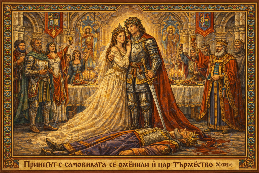 И пак заскитал по гори и полета, по планини и долини. Веднъж, като минавал през една гора, видял на една поляна чуден мраморен палат, спрял коня, загледал се в него, а като вдигнал очи към високите тераси, завило му се свят: там седяла невиждана хубавица, мома-самовила. А когато момата го погледнала, той изтървал юздите и паднал като сноп на земята. Хубавицата слязла бързо при него, свестила го с ласки и милувки, а след това се оженила за него и нямало на света ни цар, ни велможа по-щастлив от него.