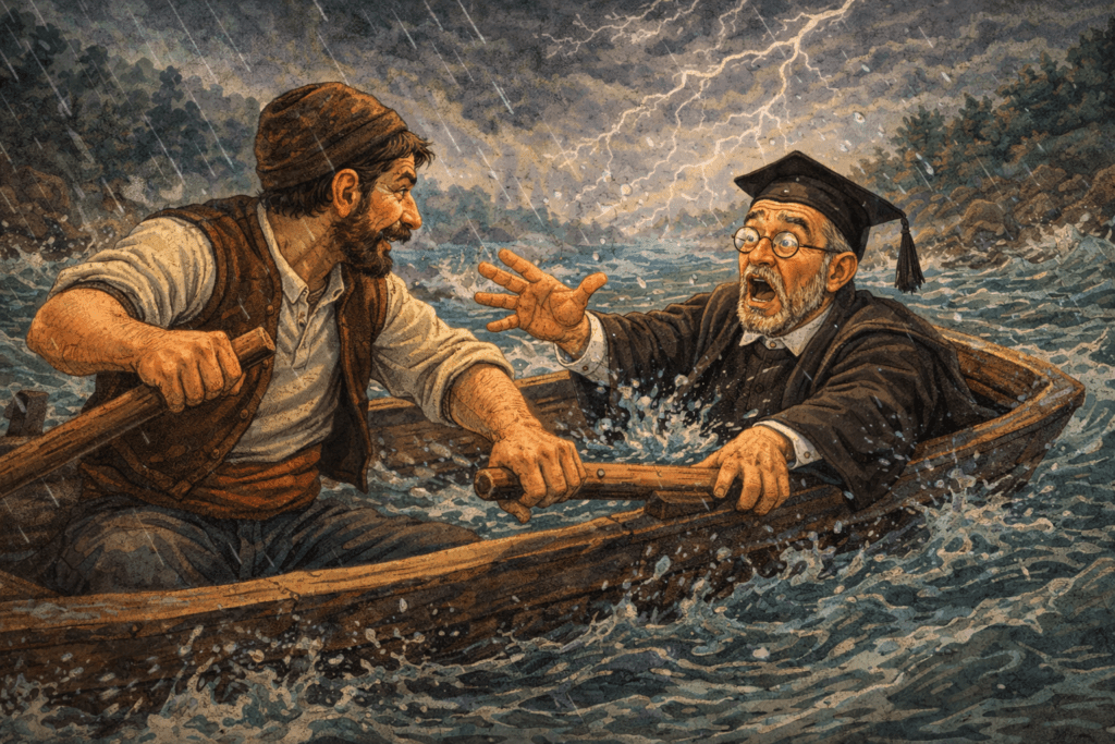Докато прехвърлял един учен педант през бурна река, рибарят казал нещо, което се сторило на онзи граматически неправилно.