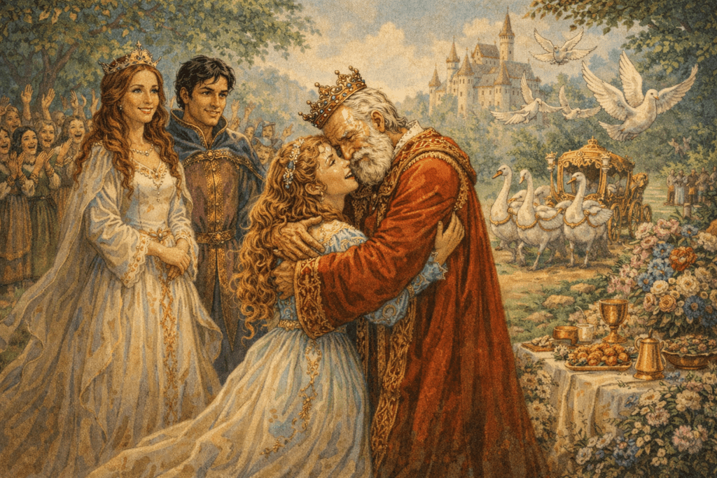 В същия миг Русокоска се намерила седнала между феята и принц Идеал в една каляска, цялата в перли и злато, теглена от четири изумително бели лебеда.