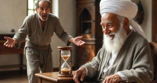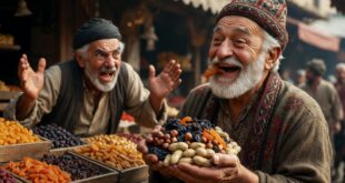 Настрадин Ходжа за пръв път в живота си попаднал в града. Блуждаейки по улиците, той стигнал до пазара. Първо на очи му се набила бакалията. Ходжа не знаел какво продават там и като влязъл вътре, видял седящ човек и около него дървени подноси със стафиди, праскови, лешници, фъстъци и всякакви други вкусни неща. Но чо¬векът не ядял от тези лакомства. …