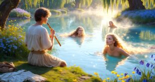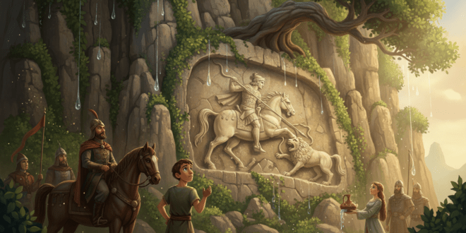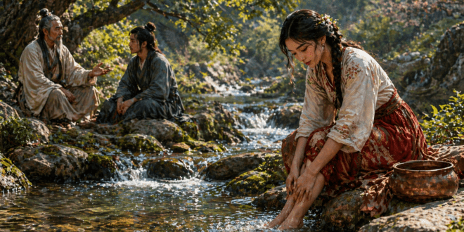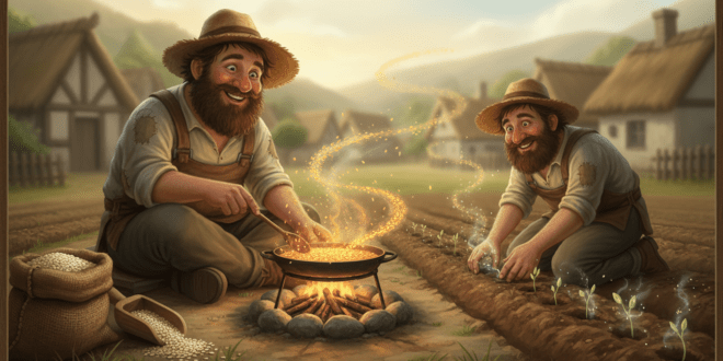 Един селянин се трудил на полето с пот на лицето, без да спре да си поеме дъх, от изгрев до залез. Веднъж се случило невероятното: докато чакал под едно дърво да премине дъждът, мълния повалила едно от дърветата недалеч. Под корените на това дърво имало пещера, от която се носело сияние. Селянинът боязливо се приближил и видял, че пещерата е …