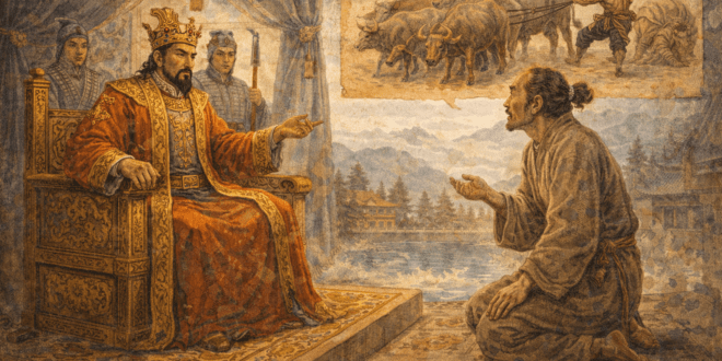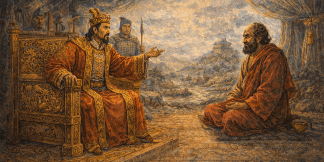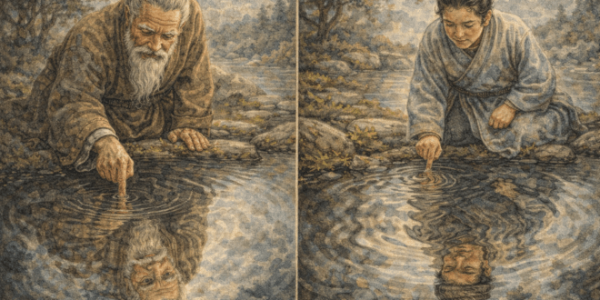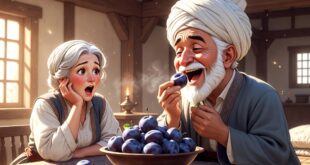 Някога живял един човек. Той бил много беден, живеел в нищета, бил задлъжнял много, а нямало с какво да си върне дълговете. И тогава избягал. Добрал се до една пустиня и там намерил ковчеже със скъпоценности и чисто огледало. То лежало върху скъпоценностите, скривайки ги. Като видял това, беднякът много се зарадвал. Вдигнал огледалото и видял в него човек. Изплашил …