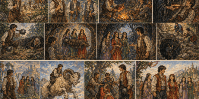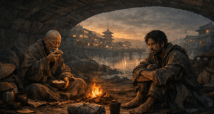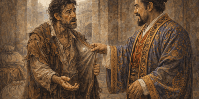 Две много бедни момчета живели от подаяния, като просели по къщите в градове и села. Единият бил сляп по рождение, а другият се грижел за него, просейки милостиня.Веднъж слепият се разболял. Приятелят му казал: