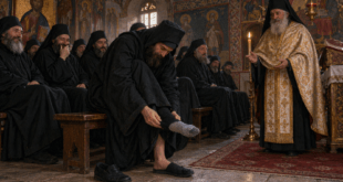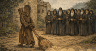 Майка казала на сина си за един велик светец: „Даже щипка прах изпод следите му вече е велика.“ Случило се така, че светецът преминавал през селището им. Момчето проследило следите му и взело щипка от тази пръст, зашило я в парче плат и започнало да я носи на шията си. Когато го изпитвали в училище, винаги държало ръката си върху …
