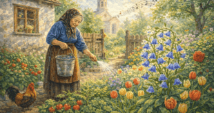 В дворчето на баба Мина има хубава градина с най-различни зеленчуци за любимите й внуци.