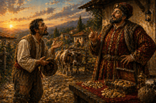 Лакома крава влязла в чуждо жито. Пасла що пасла, тъпкала що тъпкала, но стопанинът на нивата я видял и след като я прогонил отишъл и се оплакал на кмета, който заповядал: – За тази направена пакост собственикът на кравата да даде на стопанина на нивата толкова зърно, колкото да засипе цялата ми патерица! – И куцият кмет топнал по пода …