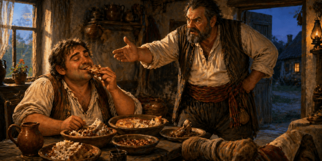 В един доста заможен селянин имал здрави волове, но бил такъв скъперник, че постоянно ги давал да работят срещу наем, а ако през това време му потрябвало да превози нещо свое, той впрягал на мястото на воловете себе си и синя си и пак свършвали работата. еднъж така впрегнати отишли чак до гората за дърва. И понеже синът през всичкото …