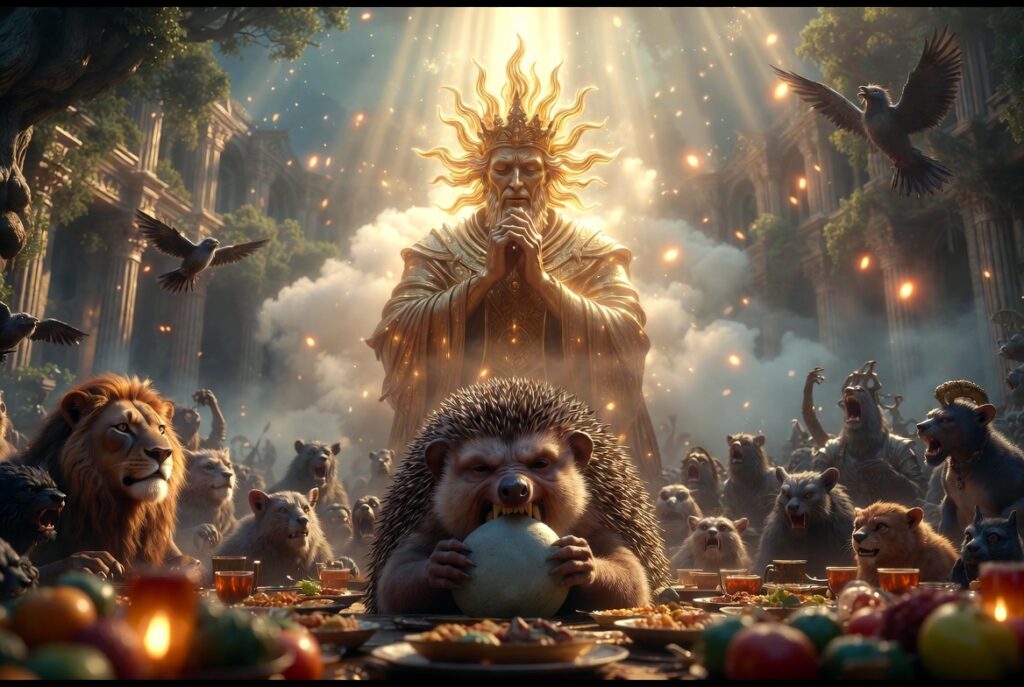 По едно време слънцето излязло с потъмняло от мъка лице и казало, че няма да се жени. Всички животни наскачали тогава да убият таралежа. Но той бързо се скрил в дупката си и излязъл едва когато всички се разотишли. До това време таралежът нямал игли по кожата си, но тогава му порасли – слънцето му дало игли да се пази от другите животни. И той сега не им се бои, свива се на кълбо и, ако можеш, хващай го.